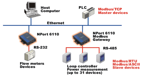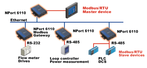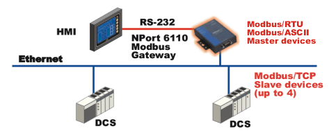 許多 HMI (人機(jī)界面) 系統(tǒng)使用串行接口,要求對分散的DCS系統(tǒng)進(jìn)行存取。然而,越來越多的DCS系統(tǒng)支持以太網(wǎng),并且運行在Modbus/TCP 從模式下。為此, NPort 6110 Modbus 網(wǎng)關(guān)是通過以太網(wǎng)連接HMI到分散的 DCS系統(tǒng)的理想解決方案。每個NPort 6110最多支持4個 Modbus/TCP 從設(shè)備。