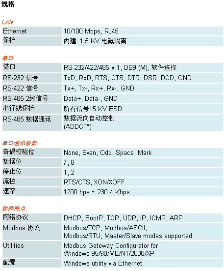 NPort 6110 支持一個以太網(wǎng)和一個可軟件選擇的RS-232/422/485 口來連接各種類型的支持 Modbus協(xié)議的設(shè)備。通過Modbus/TCP (Ethernet) 和 Modbus /ASCII/RTU (Serial) 協(xié)議轉(zhuǎn)換, 帶有以太網(wǎng)的 PLC可以使用 RS-232/422/485 接口來實現(xiàn)與儀器的無縫通訊。