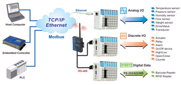 ioLogik 也提供一個傳統的 RS-485 分布式 I/O 模塊,可以在現有的應用程序上運作,還可以在無線串口設備聯網服務器的協助下,甚至可以通過無線局域網絡連接到傳感器。