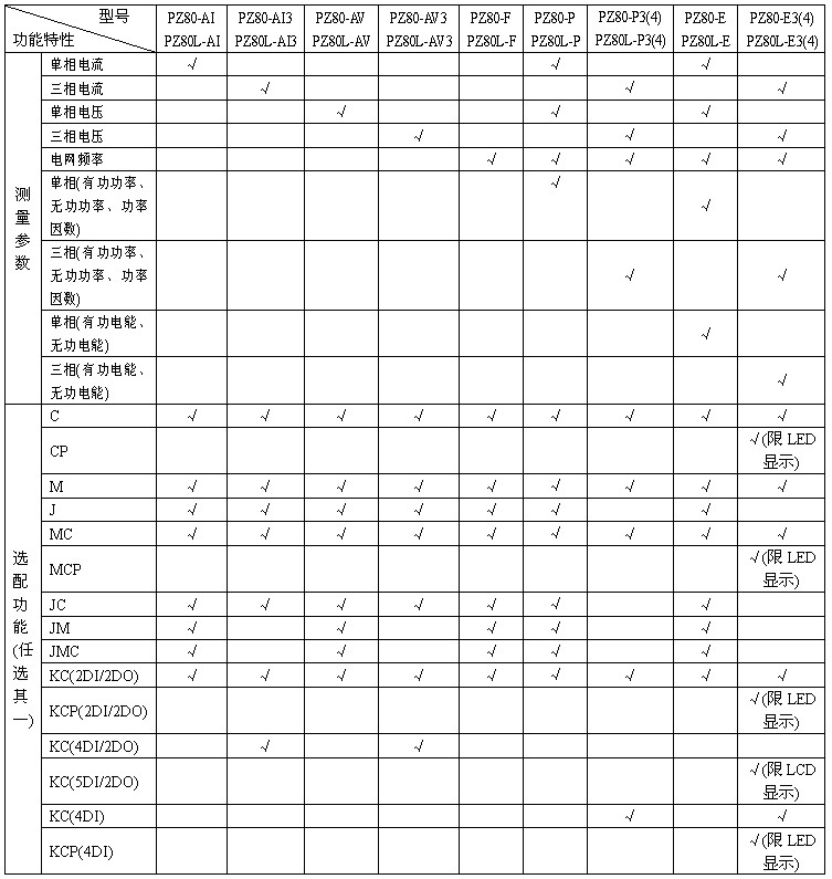 3、PZ80(L)-E3(4)在選配KC(4DI)功能時具備1路有功電能脈沖信號輸出端口,在選配KC(2DI/2DO、5DI/2DO)功能時無脈沖信號輸出端口;