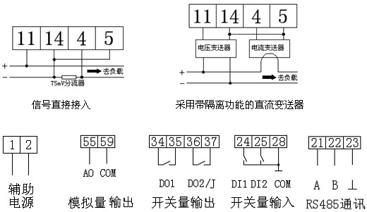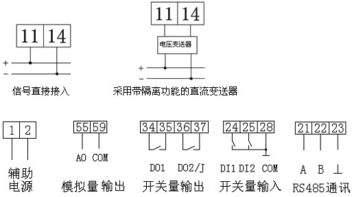 注:J(繼電器越限報警輸出)與第二路開關(guān)量輸出復(fù)用。