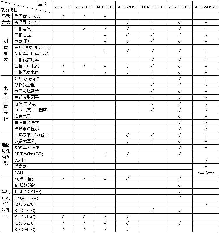 1、ACR300E、ACR310E、ACR320E(L)在選配K(4DI/4DO、8DI/4DO)功能時無脈沖信號輸出端口;