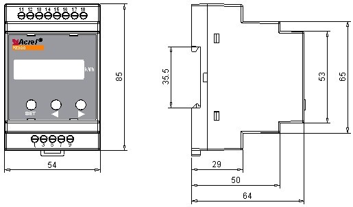二次原理見(jiàn)圖4,DTSD1352-H在電流不大于63A時(shí)可直接接入,不需要經(jīng)過(guò)電流互感器,大于63A時(shí)采用二次輸入0-5A。安裝結(jié)構(gòu)為DIN35mm導(dǎo)軌,見(jiàn)圖5。