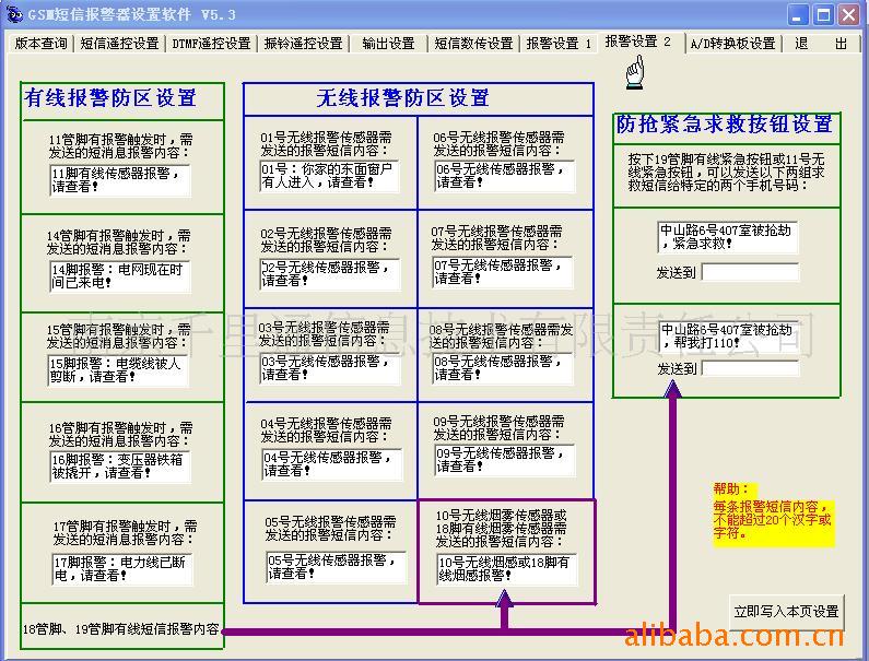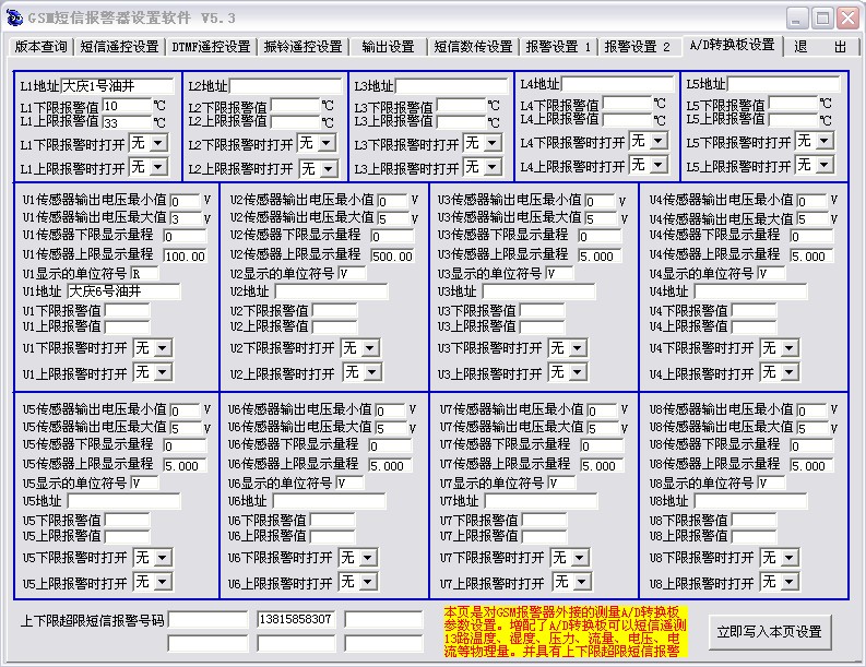 實時監測并顯示環境溫度、濕度,可以設定上下限值,當溫度、濕度值超出設定范圍時,現場發出報警聲,并自動給監控中心和已設定的管理人員手機發送報警信息,同時可以自動打開空調、除濕機等相關設備。報警號碼、報警信息、控制可有設置軟件設置,也可以通過手機短信(中文)進行設置(見下圖)。