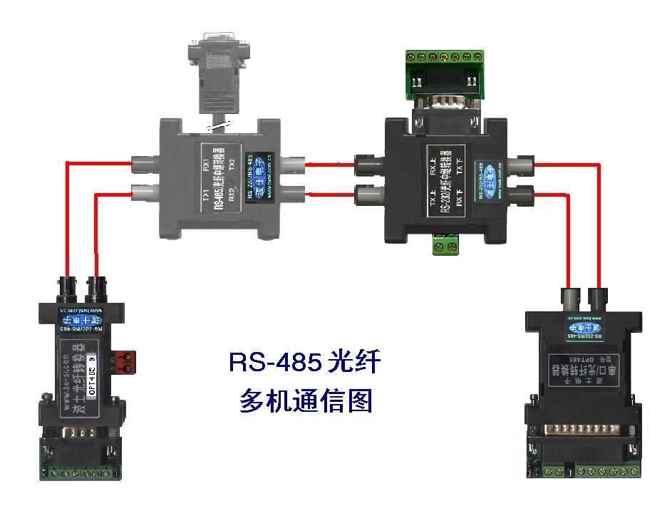 典型應用2:圖3為多臺串口設備通過多對OPT485L1進行光纖組網通信的典型應用。最遠兩端的串口設備為RS-232、RS-485或RS-422,中間的設備為RS-485口。將中間的兩個OPT485L1的A-A相連、B-B相連、GND-GND相連,再一起接到設備2的RS-485口上。這樣實現了多臺串口設備的組網通信,多機通信方法同RS-485電纜線組網。