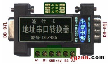 波仕DIZ485地址串口轉換器的外形為DB-9/DB-9轉接盒大小,如圖,產品左邊為主串口,包括DB-9孔的RS-232口,和標明為A1、B1的RS-485口。右邊為從串口,包括DB-9針的RS-232口,和標明為A2、B2的RS-485口。左上側J2、J1、J0為波特率設置的跳線,右上側K2、K1、K0為地址編碼設置的跳線,下面中間為5V電源接線端子。主串口與從串口之間并不隔離,它們公用GND地線和+5V電源。DIZ485的左邊DB-9孔可以直接外插計算機的RS-232口,右邊的DB-9針引腳分配同計算機的RS-232口,但是都只有RXD、TXD、GND三根線。DIZ485需要外接直流5V電源。外接5V電源要求5V(±0.5V) 50mA,產品配套有5V微型開關穩壓電源。