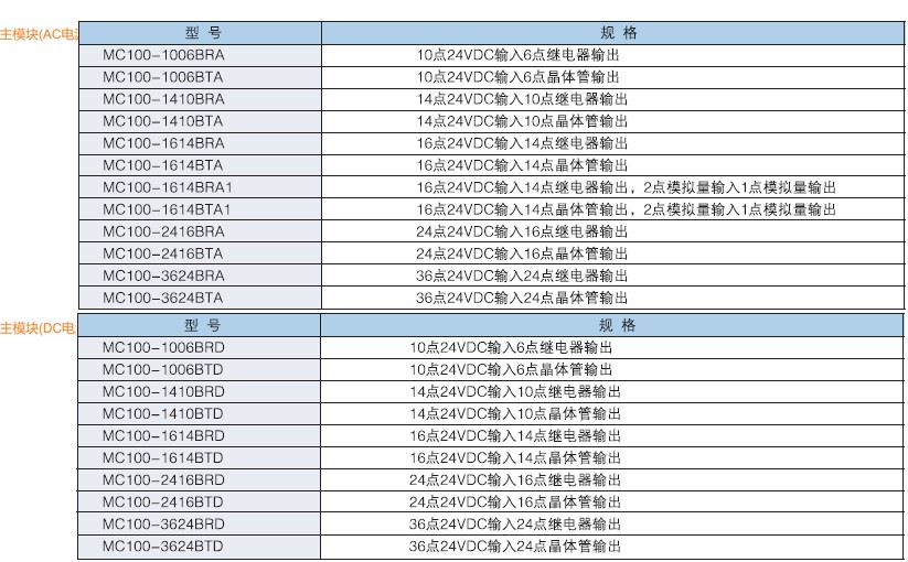 10輸入/6輸出、14輸入/10輸出、16輸入/14輸出、24輸入/16輸出、36輸入/24輸出、16輸入/14輸出/2模擬量輸入/1模擬量輸出 |