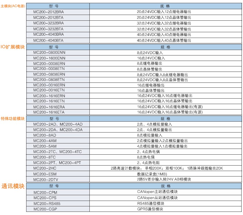 MC200系列是一款小型高性能PLC,具有強大擴展功能和通信組網功能,能進行高速數據處理、模擬量處理,具有高速計數和高速脈沖輸出定位控制功能。已廣泛應用于大型機床設備、紡織印染、工程機械、拉絲設備、塑料機械、電子設備、電梯、空調、地鐵等行業。
