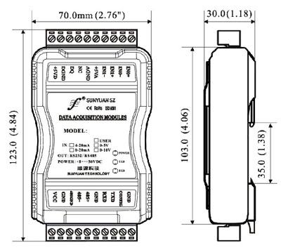 概述 SYAD08T系列產品實現傳感器和主機之間的信號采集,用以檢測模擬信號或控制遠程設備。通過軟件的配置,可用于多種傳感器類型,包括:模擬信號輸入,模擬信號輸出,和數字信號輸入/輸出,SYAD08T系列產品可應用在 RS-232/485總線工業自動化控制系統,熱電偶信號的測量、監視和控制,小信號的測量以及工業現場信號隔離及長線傳輸等等。 產品包括電源隔離,輸入輸出信號隔離、線性化,A/D轉換和RS-485串行通信。每個串口最多可接256只 SYAD08T系列模塊,通訊方式采用ASCII字符通訊協議或MODBUS RTU通訊協議,其指令集兼容于ADAM模塊,波特率可由用戶設置,能與其他廠家的控制模塊掛在同一RS-485總線上,便于計算機編程。 SYAD08T系列產品是基于單片機的智能監測和控制系統,所有的用戶設定的校準值,地址,波特率,數據格式,校驗和狀態等配置信息都儲存在非易失性存儲器EEPROM里。 SYAD08T系列產品可以測量各種傳感器信號,包括熱電阻,熱電偶,應變片等,具體選型請參看不同型號產品所支持的類型編碼。 SYAD08T系列產品按工業標準設計、制造,信號輸入/輸出之間隔離,可承受3000VDC隔離電壓,抗干擾能力強,可靠性高。工作溫度范圍- 45℃~+85℃。