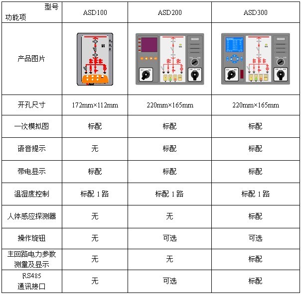 ASD系列開關柜綜合測控裝置用于3~35kV戶內開關柜,適用于中置柜、手車柜、固定柜、環網柜等多種開關柜。具有一次回路模擬圖及開關狀態指示,高壓帶電顯示,自動溫濕度控制,人體感應自動照明,語音提示,電參數測量及RS485通訊接口等眾多功能,集操作、顯示于一體。