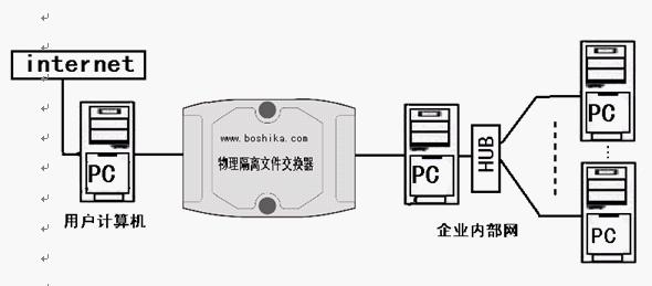 波仕的物理隔離文件交換器是一種內部帶存儲器、外部帶2個USB口的設備,利用軟件或者硬件的方法將內部存儲器通過“網絡閘門”分別切換接到進行文件交換的兩臺計算機的USB口上。在不同的時刻物理隔離器的內部存儲器分別與其中一臺計算機進行文件交換,然后內部存儲器切換到與另外一臺計算機進行文件交換,這樣間接實現兩臺計算機之間的文件交換。這樣的文件交換由于在任何時刻,兩臺計算機都沒有直接相連,也就是物理隔離的。波仕的物理隔離文件交換器也可以用于任何兩臺計算機之間進行安全的文件交換。物理隔離隔離了全部七層網絡層,是徹底的隔離。本產品已經獲得發明專利,專利號:200920086911,侵權必究。