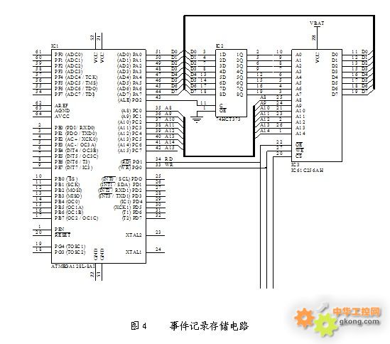 SOE事件記錄存儲器使用32k低功耗SRAM(IC3)IC61C256AH和后備電源形成一個斷電不丟失的數據存儲單元,使用數據鎖存器74HC373(IC2)和CPU的PC端口組成15位數據地址對IC3進行數據存儲操作(見圖4)。