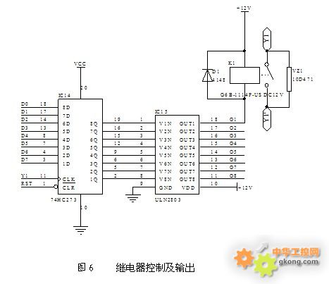 繼電器控制輸出使用一個74HC273(IC14)鎖存需要輸出的8路繼電器輸出狀態,再經由ULN2803(IC15)驅動對應的繼電器(K1只是16路中的一路),二極管D1可以旁路繼電器K1在斷開的瞬間所產生的反向電流,而并接在K1輸出接點上的壓敏電阻VZ1則可以吸收關斷后級感性負載所產生的反向電動勢,有效延長輸出繼電器觸點的壽命(見圖6)。