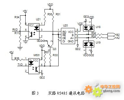 通訊方式采用雙路RS485方式,調試及設定和上位機通訊部分在物理上分成兩路,互不干擾,有效防止可能存在的誤操作(見圖3)。