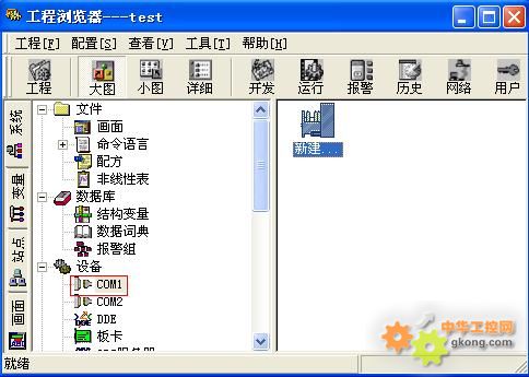 1、打開組態王工程瀏覽器——設備(COM1),雙擊右側“新建”