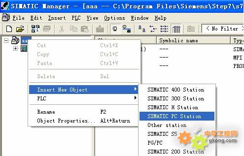 2、 選擇STEP7項目頂端,點擊鼠標右鍵,在彈出的快捷菜單中選擇Insert New Object\SIMATIC PC Station。