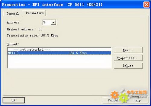 3、 選擇新建的PC Station,雙擊Configuration打開組態(tài)對話框,在右面Catalog中選中SIMATIC PC Station\CP PROFIBUS\CP5611\SW6.0(任意版本),然后拖拉到左面PC機架的1號槽,在彈出的PROFIBUS接口屬性對話框中直接點擊OK按鈕即可(不要去新建PROFIBUS網(wǎng)絡(luò),因為我們需要設(shè)置CP5611為MPI方式)。雙擊CP5611,在彈出的屬性對話框中設(shè)置CP5611的接口協(xié)議為MPI,點擊Properties按鈕,在彈出的MPI接口屬性中選擇MPI(1)。由于MPI網(wǎng)絡(luò)上地址不可以相同,因此STEP7軟件會自動給CP5611提供一個MPI地址(如3)。