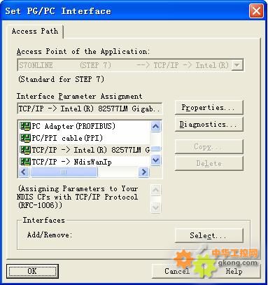 打開STEP7編程軟件,選擇菜單”O(jiān)ptions\Set PG/PC Interface…”,在彈出對話框中選擇TCP/IP->(計算機網(wǎng)卡),按”確定”退出。
