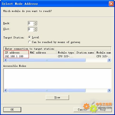 在彈出的Select Node Address對話框的IP address一欄中輸入BCNet-S7MPI的IP地址。