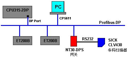 在本案例中SICK智能型固定式一維條碼掃描器CLV430-0010用于郵政分揀系統中EMS信件條形碼的掃描讀取,配備連接模塊CDB420-001提供RS232通訊接口;在實際的控制系統上選用了西門子集成PROFIBUS-DP主站接口的CPU315-2DP處理器,考慮到布線、編程和系統擴展方便,設計選用網關將CLV430接入PROFIBUS-DP網絡;