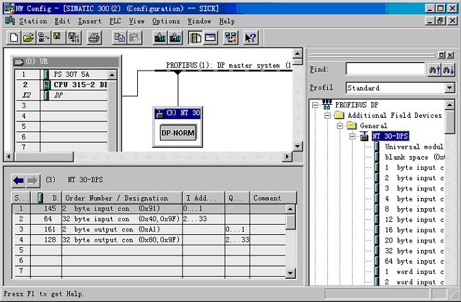 打開STEP7中的Hardware,將網關隨機光盤中的GSD文件夾下的HIL_08EA.GSD和Hil_0916.gsd文件添加到硬件庫中,然后選擇Profibus DP\Additional Field Devices\General\NT 30-DPS條目,將其拖拉到Profibus-DP網絡線,設定其Profibus-DP地址為3,組態2個字節的輸入(控制字)、32個字節的輸入(接收消息區)、2個字節的輸出(控制字)和32個字節的輸出(發送消息區);如下圖所示: