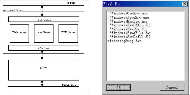 對于型號PKV40-PB來說,其內部嵌入了赫優訊的通訊模塊COM-PB,因此它是一個Profibus主站;同時嵌入式主板上提供了一個以太網通訊口,因此它也可以實現以太網通訊,所有通訊功能的實現由內部FLASH中的EXE程序來執行,下面是PKV的內部軟件結構圖和內部FLASH程序: