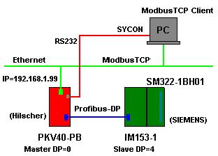 如上圖所示,PKV40-PB作為DP主站,地址為0;IM153-1作為DP從站,地址為4,同時擴展了一塊16DO的SM322模塊以方便觀察數據交換;PC機上運行ModbusTCP客戶機軟件,與作為ModbusTCP服務器的PKV通訊,PKV以太網端口IP為192.168.1.99。采用赫優訊SYCON軟件來完成PKV的通訊組態。