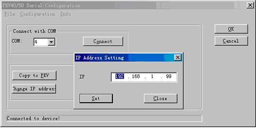 選擇Tools菜單->PKV40-PB->PKV40SerialConfiguration,在彈出的對話框中選擇相應的串口,然后點擊Connect按鈕連接到PKV,然后選擇Configuration菜單中的相關菜單設置PKV的IP地址和子網掩碼,如下圖所示: