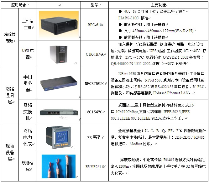 現場設備層設備為133臺電力儀表。這些設備分別根據設計要求安裝在相應的配電回路上。通過RS-485接口實現與上位機系統的數據交互。多功能表和漏電儀表的通訊規約為Modbus-RTU,保護裝置的通訊規約為IEC60870-5-103;通訊管理層由2臺Nport-5630串口服務器和1臺交換機構成,實際工程中使用了8個485串口,剩下8個串口備用。串口服務器將RS-485總線協議轉換為工業以太網協議,通過TCP/IP與站控管理層主機相連,構建數據鏈路。通訊管理層設備均安裝在電氣值班室的值班人員操作臺中,與站控管理層設備安裝在一起; 站控管理層設備為華北工控主機、顯示器、HP打印機以及山特UPS電源,均安裝在電氣值班室的操作臺中。通過安裝在主機上的Acrel-2000電力監控系統軟件實現對現場儀表數據的采集、處理以及各種人機交互功能,具體設備如下表: