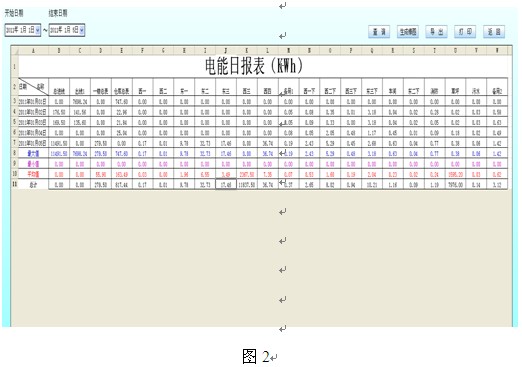 對(duì)信號(hào)采集系統(tǒng)所采集實(shí)時(shí)數(shù)據(jù)進(jìn)行統(tǒng)計(jì)、分析、計(jì)算,將數(shù)據(jù)進(jìn)行定時(shí)存儲(chǔ)。并通過計(jì)算產(chǎn)生每日/周/月/年用電量;每日/周/月/年最大負(fù)荷及最大負(fù)荷出現(xiàn)時(shí)間,對(duì)存在故障隱患的設(shè)備及時(shí)提出整改;通過電能分時(shí)計(jì)量累計(jì)電費(fèi),對(duì)不合理用電單位提出科學(xué)合理的改進(jìn);通過邏輯運(yùn)算計(jì)算出設(shè)備正常、異常出現(xiàn)次數(shù),存儲(chǔ)事故發(fā)生時(shí)間、原因。電能報(bào)表如圖2所示: