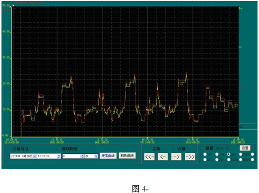 負(fù)荷趨勢(shì)曲線提供了某一段時(shí)間內(nèi)該回路的負(fù)荷趨勢(shì),方便管理員掌握用電設(shè)備的運(yùn)行狀況,對(duì)存在故障隱患的設(shè)備及時(shí)提出整改,對(duì)不合理用電單位提出科學(xué)合理的改進(jìn)。如圖4所示: