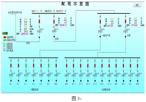 19寸彩色液晶顯示作為人機(jī)交互界面,實(shí)時(shí)顯示配電系統(tǒng)各種信息畫面,包括各斷路器當(dāng)前狀態(tài)、各回路當(dāng)前電壓、電流、功率等測(cè)量值的實(shí)時(shí)信息。聲光提示報(bào)警信息、保護(hù)設(shè)備動(dòng)作及復(fù)位信息。實(shí)時(shí)畫面如圖3所示:
