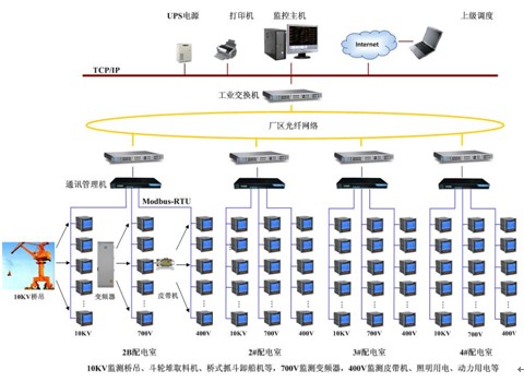 本項(xiàng)目四個(gè)分變內(nèi)10kV配電室監(jiān)控的設(shè)備為碼頭的橋吊、斗輪堆料機(jī)、斗輪取料機(jī)等大型設(shè)備;700V配電室監(jiān)控的設(shè)備為變頻器;400V配電室監(jiān)控的設(shè)備為廠區(qū)照明用電、皮帶機(jī)、維修設(shè)備等。數(shù)目都少于10個(gè),所以12個(gè)子配電室現(xiàn)場(chǎng)只需各鋪設(shè)一根總線即可,該總線將智能電測(cè)儀表以菊花鏈的方式連接起來(lái),然后引致各分變的網(wǎng)絡(luò)配置室即可。四個(gè)分變的四個(gè)網(wǎng)絡(luò)配置室各配有一個(gè)8口的通訊服務(wù)器和 一個(gè)思科的光端機(jī),配置完成之后將采集上來(lái)的數(shù)據(jù)傳至辦公大樓八樓計(jì)算機(jī)房?jī)?nèi)的系統(tǒng)后臺(tái)監(jiān)控主機(jī)。本項(xiàng)目的遠(yuǎn)程抄表及電能管理系統(tǒng)后臺(tái)設(shè)有高性能工業(yè)計(jì)算機(jī)、顯示器、UPS電源、打印機(jī)、報(bào)警蜂鳴器等設(shè)備。監(jiān)控系統(tǒng)安裝在計(jì)算機(jī)上,集中采集顯示現(xiàn)場(chǎng)設(shè)備運(yùn)行狀況,以人機(jī)交互的形式顯示給用戶,同時(shí)用戶可以通過(guò)系統(tǒng)軟件發(fā)送指令至現(xiàn)場(chǎng)設(shè)備,實(shí)現(xiàn)遠(yuǎn)程遙控功能。