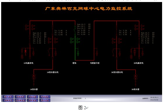 圖2所示為本系統配電監測界面,顯示了當前各回路設備運行狀態及電力參數的實時顯示。實時顯示網球中心10KV各回路三相電壓、電流;并顯示當前回路斷路器分合閘狀態,另外對于設備通訊故障以及負荷越限等非常規狀態進行聲光報警,提醒工作人員及時發現并處理突發事件,消除隱患,確保所有設備在安全穩定的環境下運行,