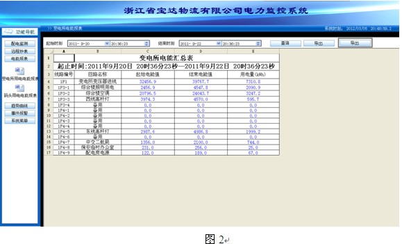 對信號采集系統所采集實時數據進行統計、分析、計算,將數據進行定時存儲。并通過計算產生每日/周/月/年用電量;每日/周/月/年最大負荷及最大負荷出現時間,對存在故障隱患的設備及時提出整改;通過電能分時計量累計電費,對不合理用電單位提出科學合理的改進;通過邏輯運算計算出設備正常、異常出現次數,存儲事故發生時間、原因。電能報表如圖2所示:
