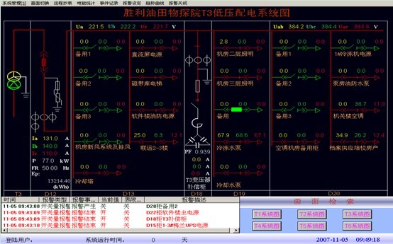 勝利油田物探研究院低壓配電系統(tǒng)主要有6臺(tái)10kv/0.4kv配電變壓器,本系統(tǒng)主要負(fù)責(zé)對(duì)低壓進(jìn)線及相應(yīng)配出回路的實(shí)時(shí)動(dòng)態(tài)監(jiān)控!
