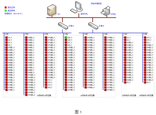 為滿足配電室統(tǒng)一監(jiān)控的要求,配電現(xiàn)場安裝的安科瑞公司網(wǎng)絡(luò)電力儀表通過屏蔽雙絞線手拉手式相連至后臺主機內(nèi)的工業(yè)串口卡,實現(xiàn)對現(xiàn)場數(shù)據(jù)的采集,存儲,處理,實時顯示以及歷史查詢,組網(wǎng)結(jié)構(gòu)圖拓撲結(jié)構(gòu)如圖1所示: