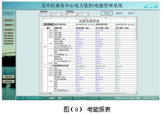 用電量報表功能,可選擇時間段進行查詢,支持任意時間段電度累計查詢,具備數(shù)據(jù)導出和報表打印等功能。為值班人員提供了精確可靠的電能報表。該報表各回路名稱和數(shù)據(jù)庫關聯(lián),方便用戶修改回路名稱。如下圖所示,顯示健身中心某段時間內(nèi)的各配電回路的精確用電量,用戶可以直接打印報表,可以以EXCEL格式另存到其他位置。 見圖(8)。