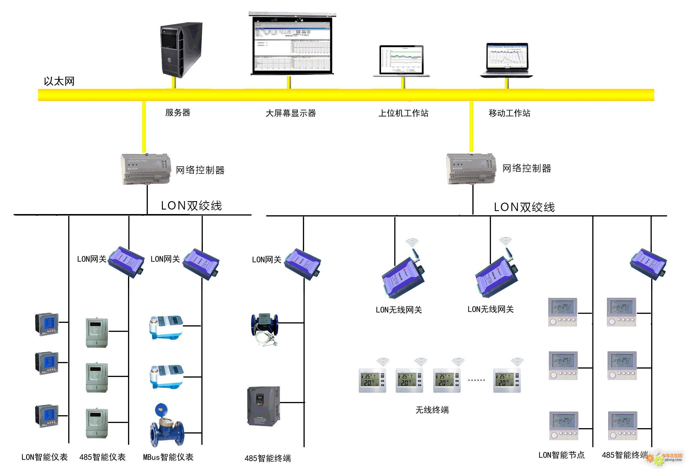 配置RS485、RS232等串口通訊接口的三相多功能電能表以其質(zhì)優(yōu)價廉,在能耗監(jiān)測領(lǐng)域被廣泛采用。不可否認(rèn)的是,此類通訊儀表存在抗干擾能力差、可靠性差、系統(tǒng)穩(wěn)定性差、布線施工難度大、通訊距離短等諸多弱點。因此,如何取長補短,發(fā)揮RS485電能表的優(yōu)勢,是這類儀表用于能耗監(jiān)測領(lǐng)域成敗的關(guān)鍵。采用海思公司iGate系列智能網(wǎng)關(guān),充分發(fā)揮在樓宇自控系統(tǒng)中廣泛采用的LonWorks網(wǎng)絡(luò)穩(wěn)定性好、可靠性高、傳輸速率高、通訊距離遠(yuǎn)、施工便捷的優(yōu)勢,結(jié)合RS485電能表質(zhì)優(yōu)價廉、采購方便的特點,能夠滿足系統(tǒng)建設(shè)的需要;