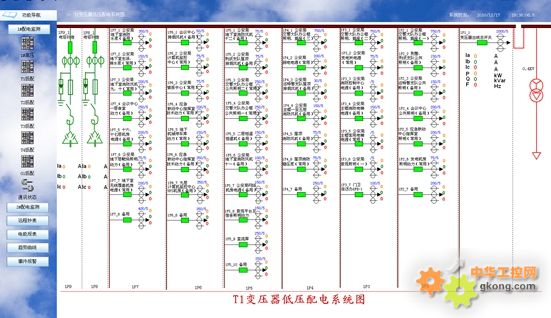 進入系統(tǒng)后通過遙測我們可以查看各回路的三相線電壓、電流、功率、電能等電參量。遙信功能則實現(xiàn)了顯示現(xiàn)場設備的運行狀態(tài),主要包括:開關的分、合閘運行狀態(tài)和通訊故障報警,斷路器變位時會發(fā)出報警信號。如下圖2,高壓配電系統(tǒng)主要監(jiān)測了高壓回路的運行狀態(tài),紅色代表合閘,綠色代表分閘;并在畫面上動態(tài)顯示三相電流、線電壓。