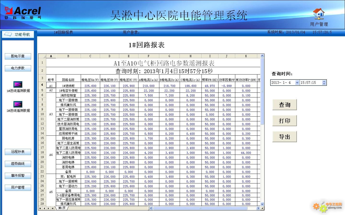 登錄普通權限用戶,通過主界面的操作,可以查看各回路運行的電參量(電流、電壓、有功、無功、功率因數、電度);登錄最高權限用戶,可以實現系統內部電度報表、電流曲線、報警信息的打印及導出功能。