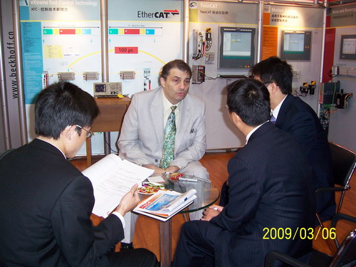 為期4 天的展會,Beckhoff 的展臺始終擠滿了駐足觀看和了解產品技術的觀眾,眾多專業觀眾對 Beckhoff 產品的安全性、實時性、開放性及對自動化控制的創新性理念留下了深刻的印象。相當多的專業媒體也來到展相當多的專業媒體也來到展臺進行采訪報道,Beckhoff中國區總經理江查理先生在現場多次接受了媒體記者的采訪。“如果將高性能工控機的CPU比喻成人類的大腦,人類的四肢就象分布式傳感器的輸入/輸出,那么人類要感知外界并完成所有復雜的動作是離不開健全的神經系統”,在談及EtherCAT實時工業以太網和ETG組織時,江查理先生自豪地說道,“Beckhoff采用和主推的EtherCAT實時工業以太網總線通訊技術,就代表了人類的神經系統,它為任何高精度、高速運動的設備提供了高性能的保證。” 目前,ETG組織在全球已有超過960家的會員,在中國也已達到60家,全球已有40多家廠商準備或已經宣布將其高性能EtherCAT伺服驅動產品推向市場。來自這些廠商的支持清晰地表明EtherCAT已成為運動控制領域的主導通訊技術。