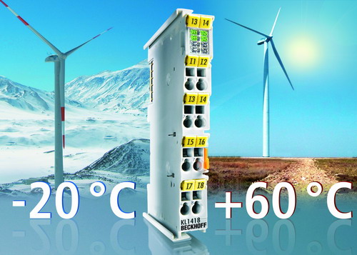 隨著一些精心挑選的標(biāo)準(zhǔn)總線端子模塊和耦合器的工作溫度范圍被拓展為 -20…+60 °C(-4…140 °F),Beckhoff 現(xiàn)在可為極端氣候區(qū)域的應(yīng)用提供支持。令人矚目的是,寬溫總線端子模塊(拓展溫度)的儲(chǔ)存溫度范圍達(dá)到擴(kuò)展的工業(yè)標(biāo)準(zhǔn) -40…+85 °C(-40…185 °F)。