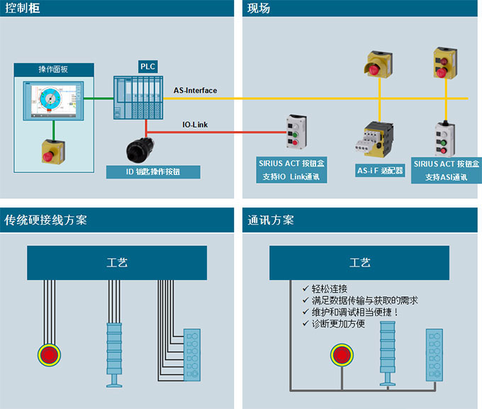 不僅能直接傳統(tǒng)接線,還能支持多種通訊協(xié)議: ASI, IO-LINK,使得SIRIUS ACT可以直接與PLC 系統(tǒng)實(shí)現(xiàn)通訊