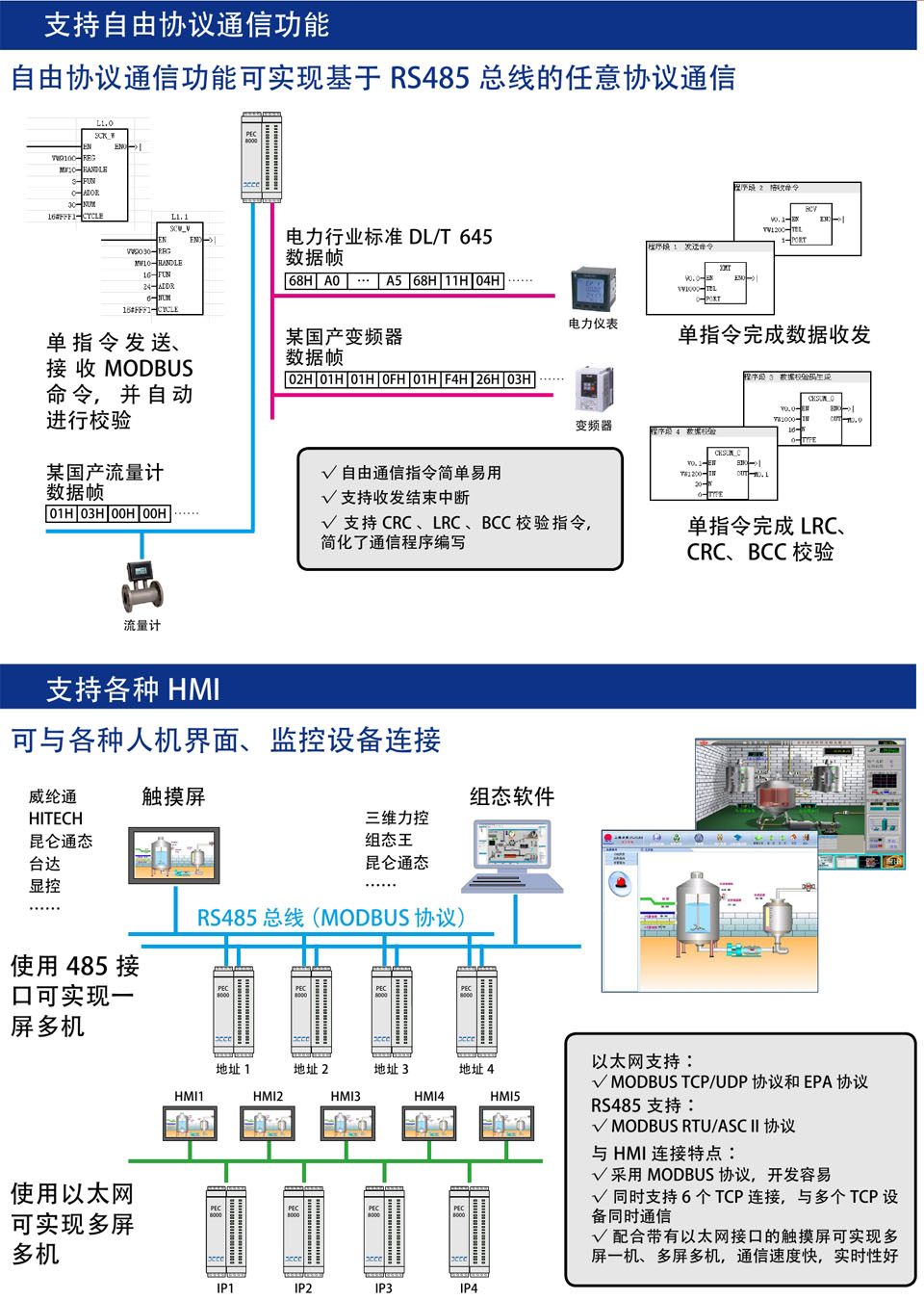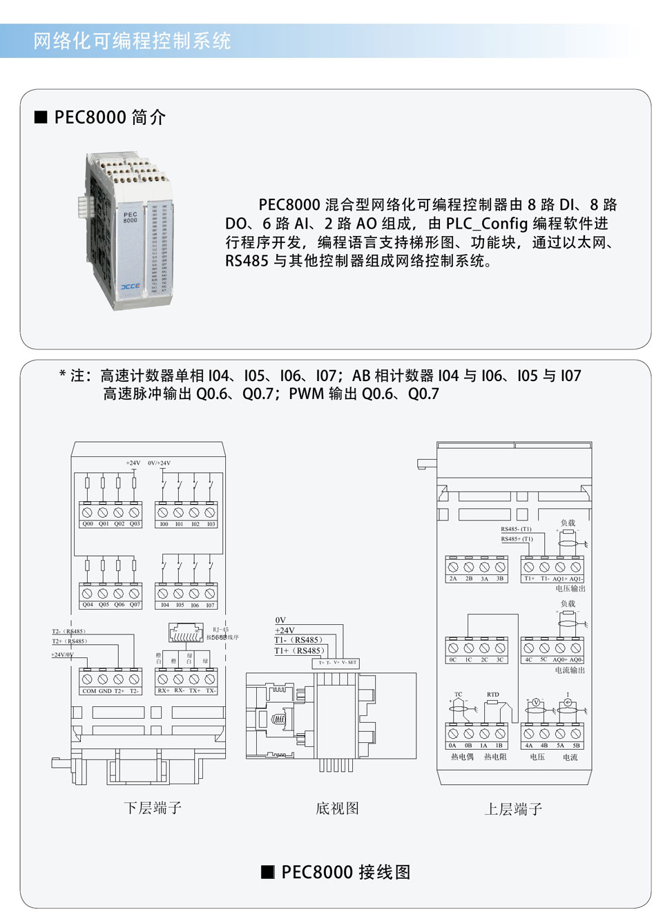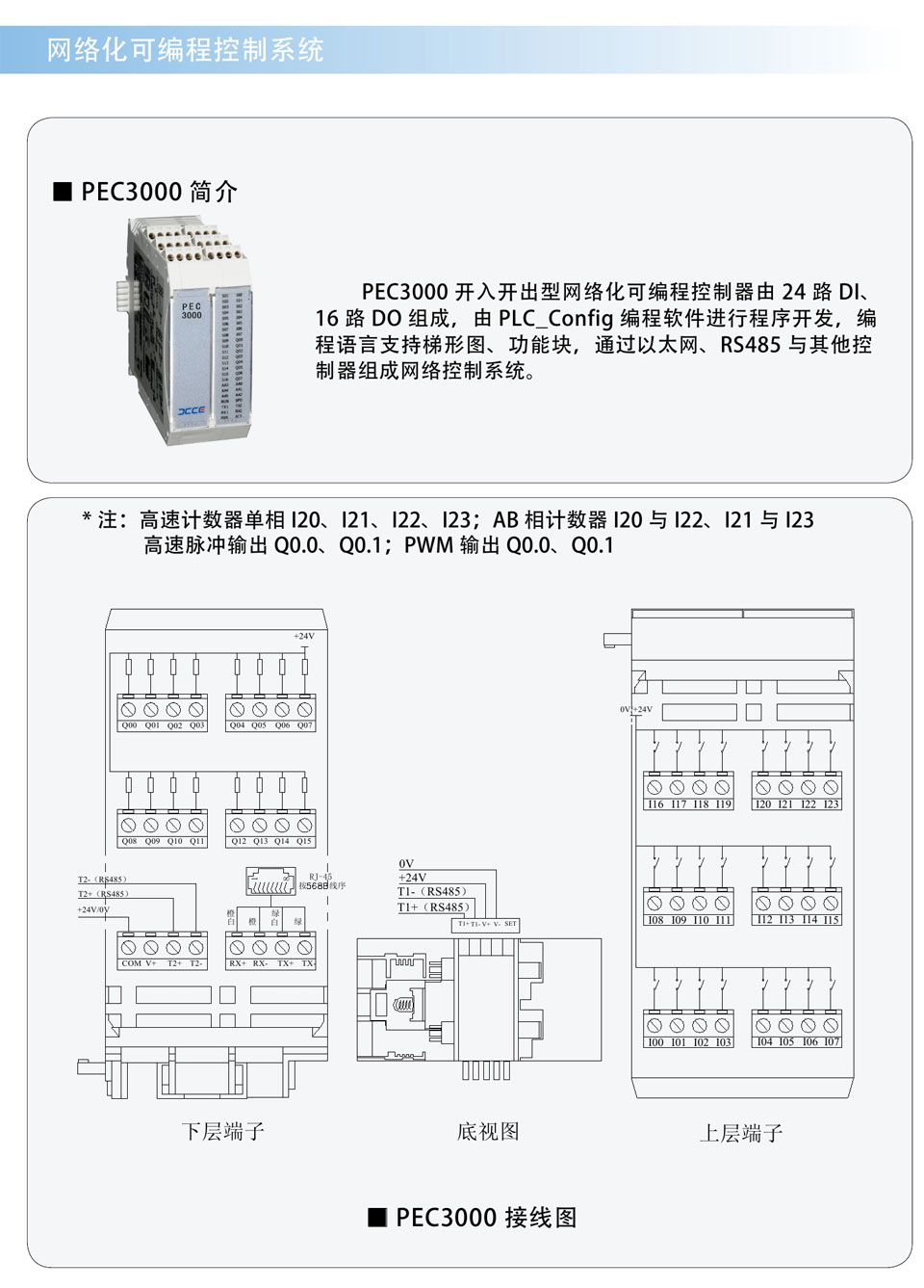 產品簡介:PEC系列網絡化可編程控制器,是擁有完全自主知識產權的新一代小體積、緊湊型可編程控制器。該控制器具有結構緊湊、功能全面、使用方便、性能穩定等特點,針對國內工控領域應用需求,強化了網絡通信、從設備管理、分布式控制、控制參數自整定等功能,形成了高性價比的系列產品。