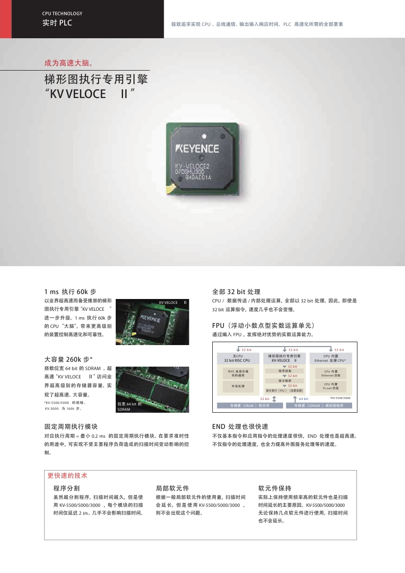 搭載超高速梯形圖執行引擎“KV VELOCE Ⅱ”,64 bit 的SDRAM, 容量達260k 步。
