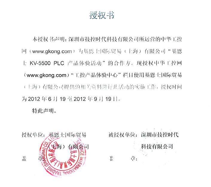 本授權書聲明:深圳市技控時代科技有限公司所運營的中華工控網(m.kblhh.cn)為基恩士國際貿易(上海)有限公司“基恩士KV-5500 PLC 產品體驗活動”的合作方。現授權中華工控網(m.kblhh.cn)“工控產品體驗中心”欄目使用基恩士國際貿易(上海)有限公司提供的相關資料進行此活動的實施工作,授權時間為2012年6月19日至2012年9月19日。